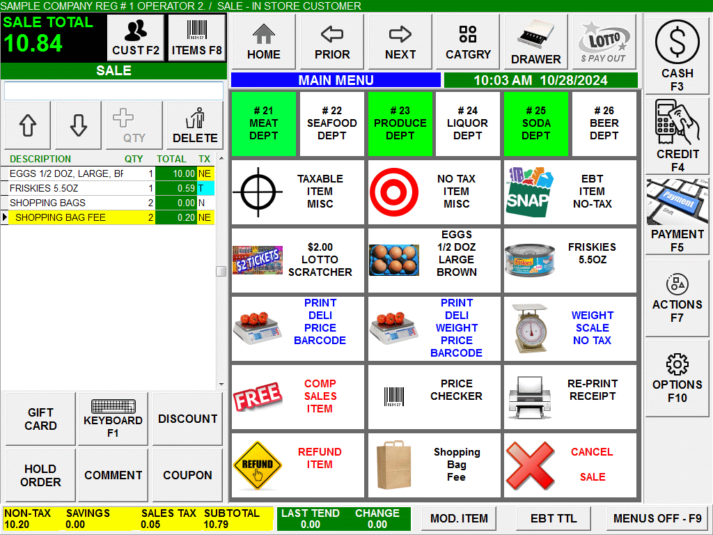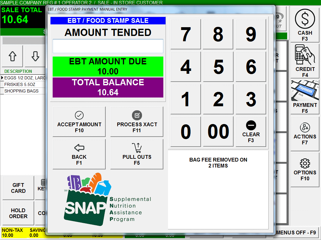 Plastic Bag Tax line showing the customer the amount of Plastic Bag Tax they were charged. EBT / Food Stamp compliance : EBT compliance is achieved by removing the Plastic Bag Tax from the current sale once an EBT, Food Stamp is selected. If the EBT payment is abandoned for any reason the Plastic Bag Tax will be added back into the order so that an alternate payment method can be selected. |