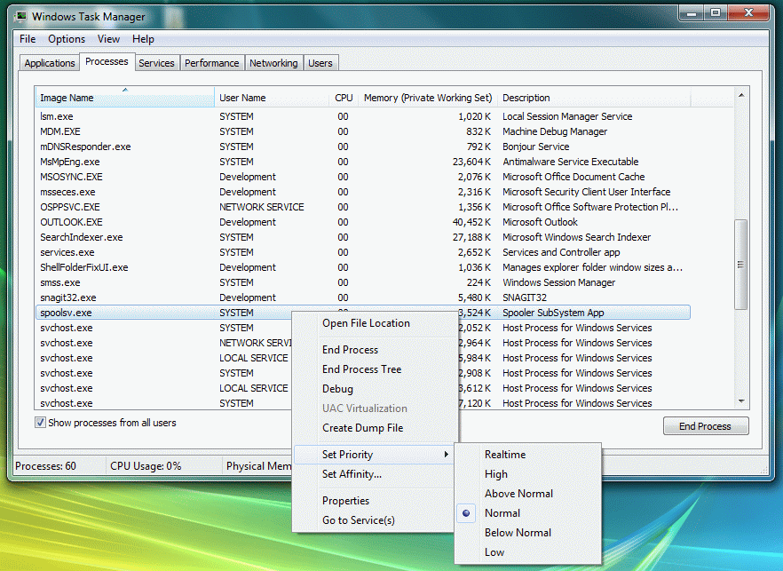 Performance Hacks : CompuReg POS Software uses the Windows Printer Spooler to send data to the printers and pole display. If you find that there is latency when ringing up items you can try changing the Windows Spooler Priority. We cannot guarantee this will improve performance due to numerous conditions such as your Pole Display Driver, Computer performance and many other factors outside of our control. We also find USB devices have the poorest performance of all windows interfaces types regardless of your USB's version level. 1. Open the Windows Task Manager. 2. Click Services then scroll down to spoolsv.exe 3. RIGHT mouse click, scroll to Set Priority. 4. Try various settings to see if you can get better performance. 5. If you Restart Windows the setting may revert back to normal priority. Consult with your local computer expert to make these settings permanent if necessary. |